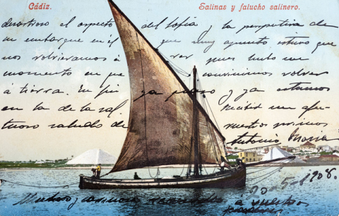 POSTAL DE UN FALUCHO SALINERO Y DE LAS SALINAS DE CÁDIZ